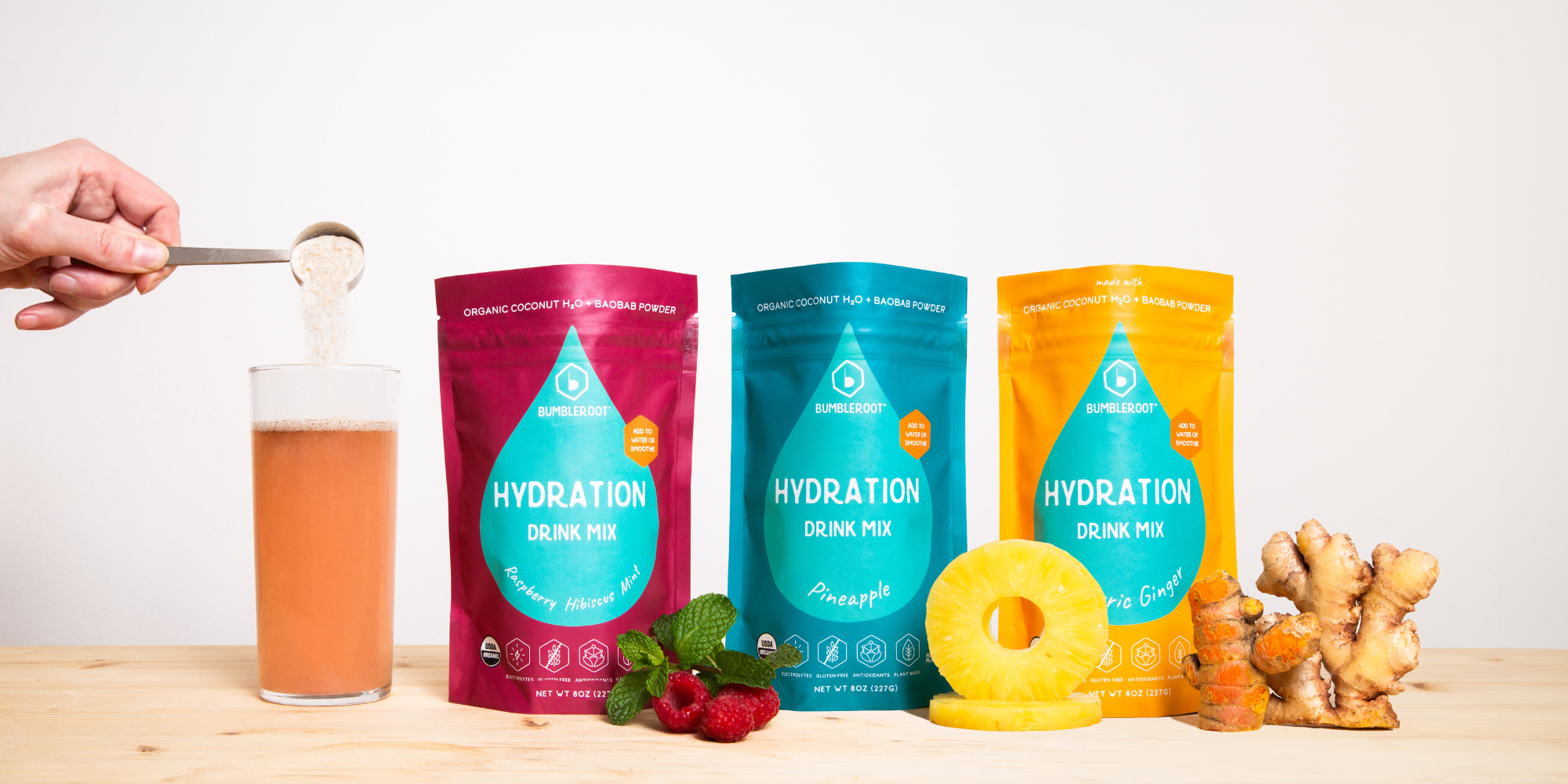 Bumbleroot Hydration has 620 mg of potassium per serving which is equal to the potassium in one and half bananas.